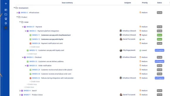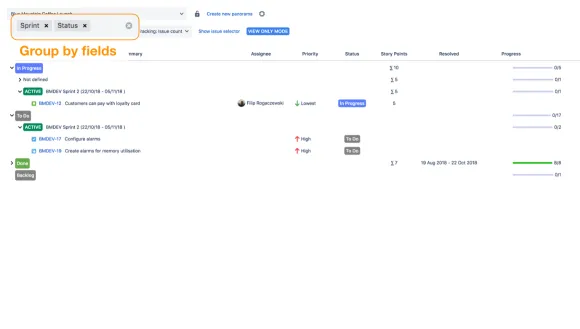 - Group Jira issues by multiple fields, such as assignee, sprint, status