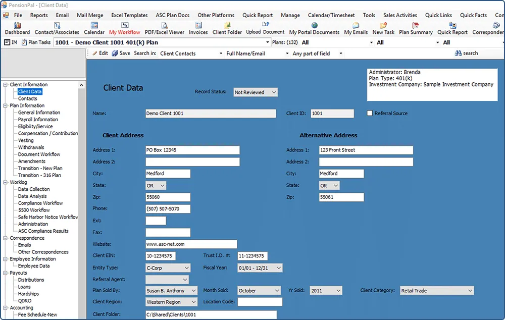 PensionPal is a client management system specifically designed for Third-Party Administrators (TPAs) to manage the four core functions of management: Plan, Organize, Direct, and Control. It provides quick access to client information, allows linking of clients with their associates such as brokers, sales agents, and accountants, and keeps plan specifications readily available for consultation. The system enables users to create reports based on specific client or plan criteria in seconds, log all client correspondence through Outlook Add-In email integration, and track all payouts including Distributions, Loans, Hardships, and QDROs. Users can attach files and emails directly to client, contact, and plan records, track employee billable time and workflow, and utilize dynamic reporting features for insights into referral sources, fees, revenue sharing, staffing, and workflow status. PensionPal integrates with ASC’s Plan Documents and DC/401(k) Systems to save time. Customizable dashboards, colors, and data fields help users quickly identify clients, prospects, and important plan data. It also supports mass creation of fillable PDF forms and detailed time and billing tracking for employee production and invoicing. The system includes 8-12 hours of CRM consulting for setup, data import, and training.