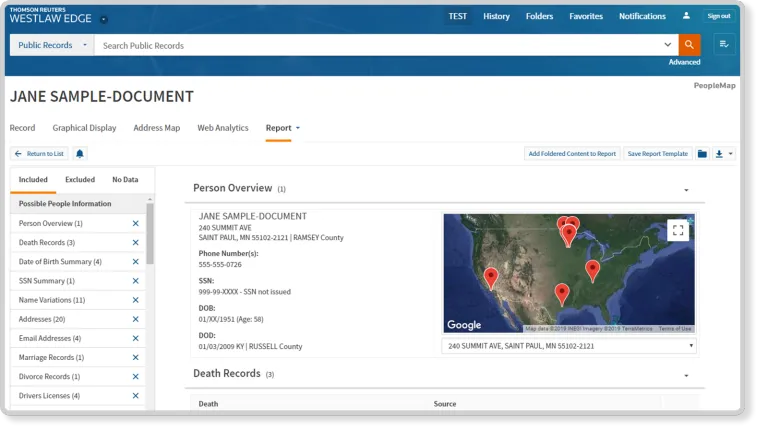 PeopleMap on Thomson Reuters Westlaw is the premier public records search tool for discovering data other resources might miss. With access to billions of public records from proprietary and trusted sources, including numerous live gateways, you can confidently get the job done faster and more accurately.