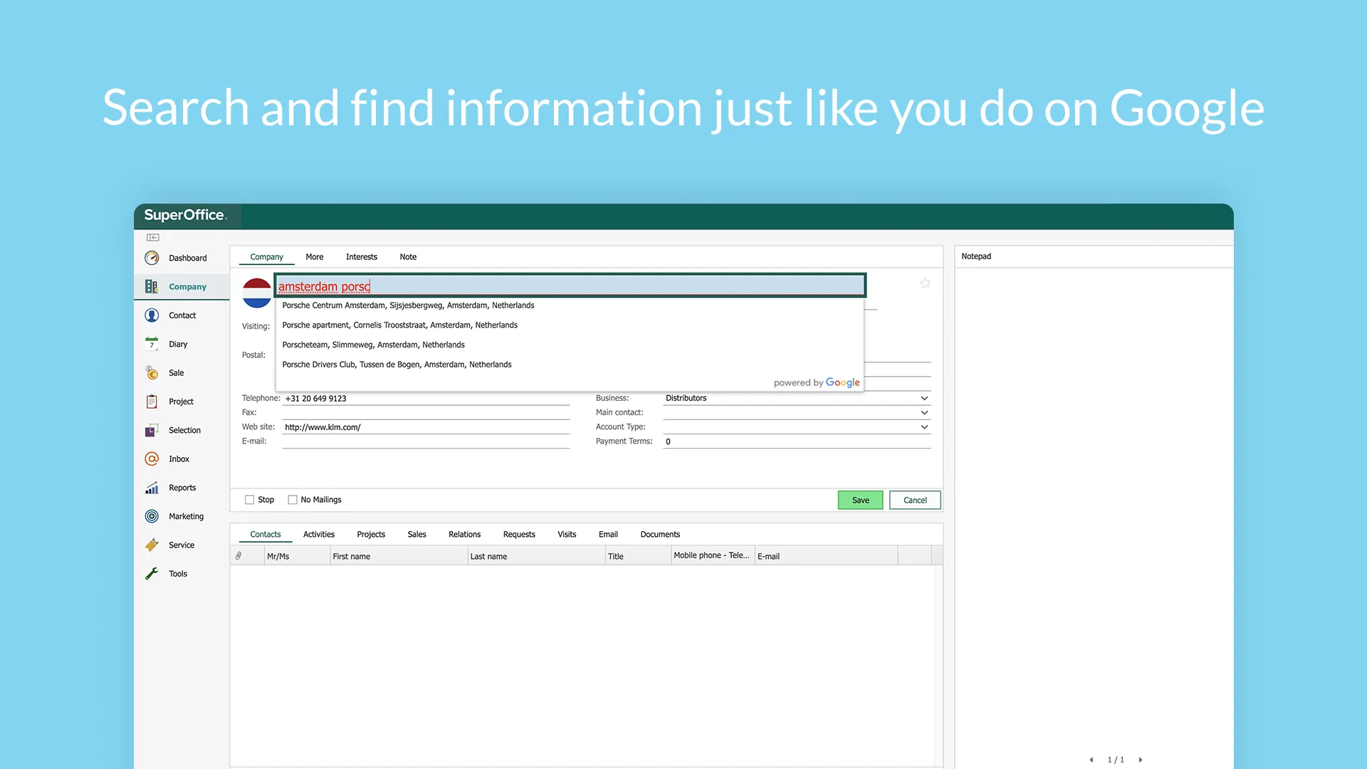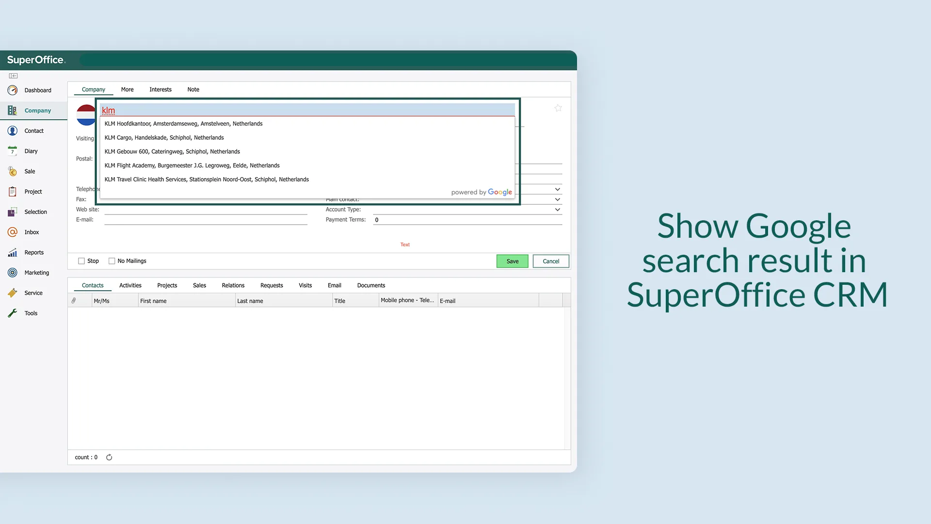 Places for SuperOffice CRM fills the company details for you from the world's most extensive database of addresses: Google Maps. With Google's mighty fuzziness algorithm, you'll find the right company even if you didn't type it correctly or only know part of the name. In just one click, all details are copied to SuperOffice CRM.