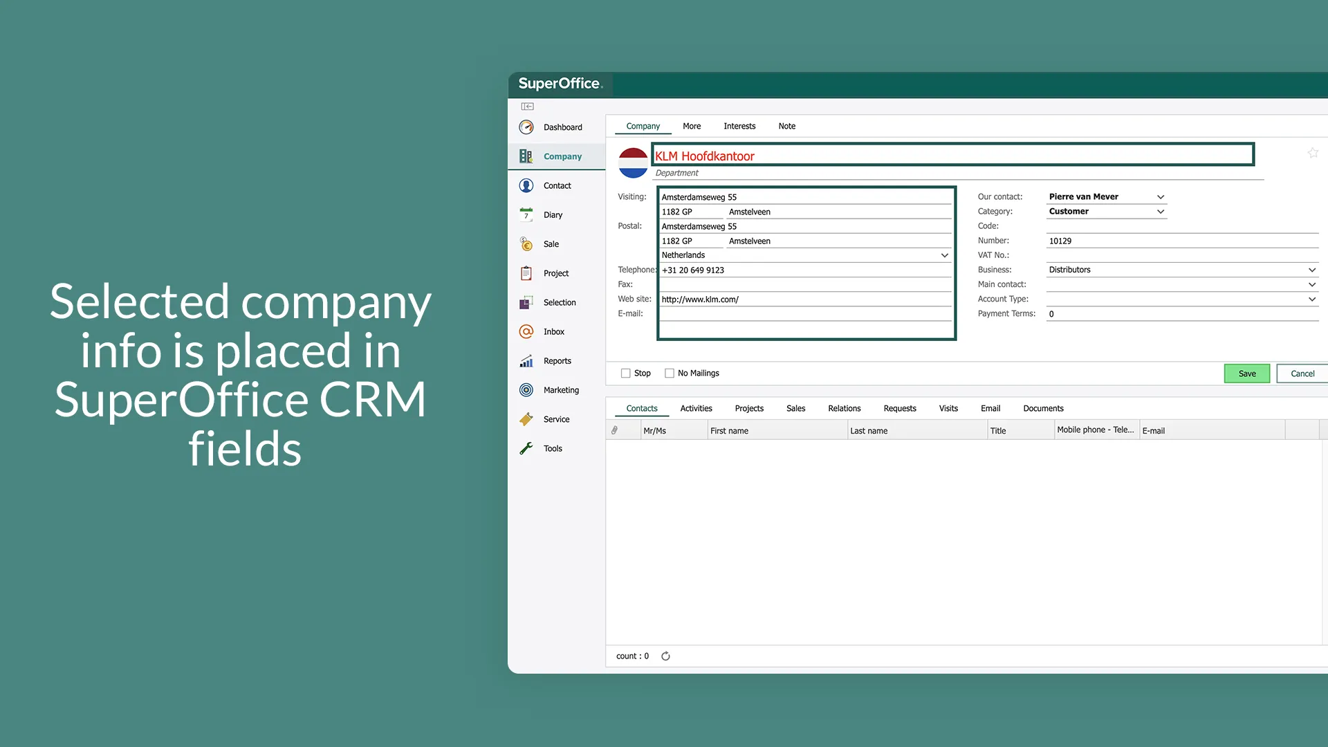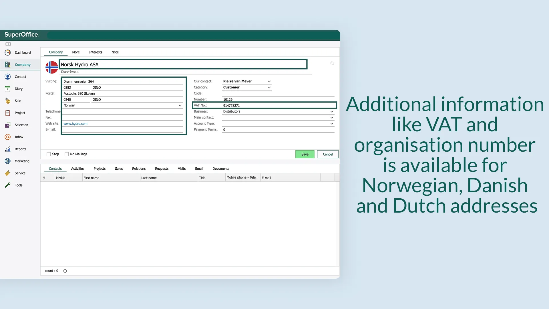 - Fully integrated on the SuperOffice CRM company card – no more jumping from window to window to find address information – enter company details in one click.