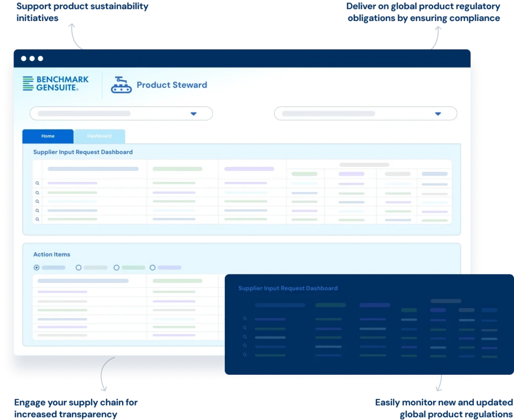 Benchmark Gensuite Product Steward is a cloud‑based solution that enables companies to manage product compliance across global regulations, engage suppliers, and oversee sustainability and supply‑chain risks in a unified platform. It helps organisations stay up to date with evolving regulatory requirements, collect supplier data, and respond efficiently to compliance and sustainability requests.