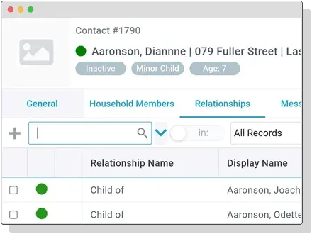 Keep track of household members or create custom relationships to manage complex family situations or to identify other relationships a person has within the church.