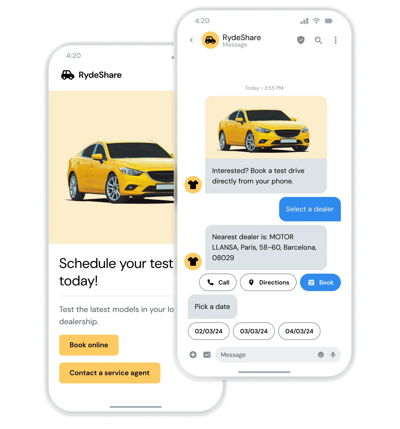 Dynamic content Take the guesswork out of engagement! Give customers suggested replies and CTAs via response buttons that’ll make their lives, and yours, so much easier. Registered senders only Only verified companies can use business RCS messaging, which means trust is built in from the get-go. And that makes it even easier to start a conversation. Real-time feedback Get closer to customers and learn more about their behavior with real-time delivery, read receipts, and activity notifications. Web/SMS fallback Worried that some phones or networks might not support RCS? No problem! We’ll turn your message into a web experience that can be sent via SMS to make sure it still gets delivered. Personalized user experience Store customer chat history and analytics with our omnichannel Conversation API to automate personalized, relevant replies. Engaging alerts Exciting carousels with images and programmable responses bring abandoned cart reminders to life and makes your promotional activities rise above the noise.