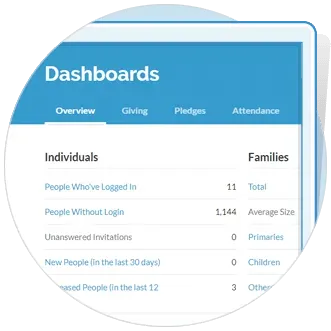 From demographics about your congregation to statistics for church health, the Overview Dashboard is out-of-the-box ready and provides church leaders needed insight into their ministry.