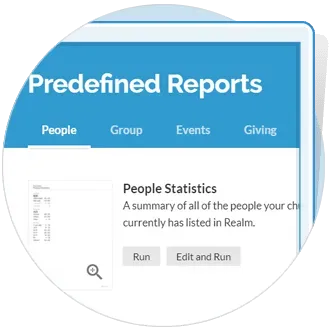 When more details are needed, staff can utilize Realm’s predefined reports for churches and ministries. From eGiving and accounting to groups and events, one of the nearly 30 reports in Realm will serve up answers to questions you have about your ministry.