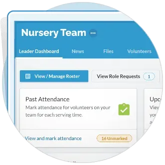 Managing volunteers can be a time consuming role for staff. Realm allows staff to select serving team leaders who manage their team’s rosters and schedules, help check in volunteers, mark attendance, and more. They can even access a volunteer dashboard for attendance metrics and overall management of their teams.
