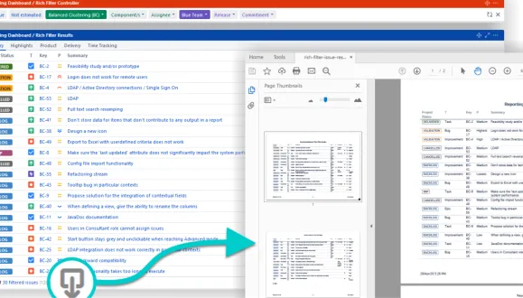 Extension for Rich Filters app. Export dynamic issue lists, stats, charts, graphs & dashboards to PDF reports.