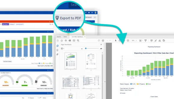 Export dynamic issue lists, stats, charts, graphs & dashboards to PDF reports