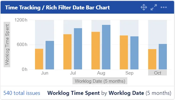 Extend your Rich Filters for Jira Dashboards with statistics, charts & filters based on work logs. Build interactive dashboards to visualize the time spent by user or by custom time period.
