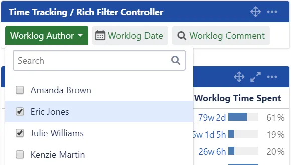 Rich Filters::Time Tracking Dashboards is an extension for the Rich Filters for Jira Dashboards app. Use Worklog Query Language (WQL) to power advanced statistics, filters and reporting on work logs. Base filters and statistics on worklog attributes including: