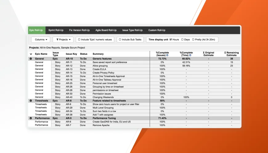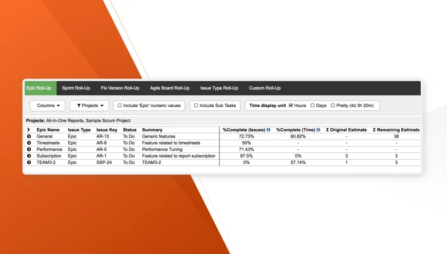 - Roll-up metrics from related issues into Epic, Sprint, Fix Version, Agile Board, Issue Type, and any standard or custom Jira field