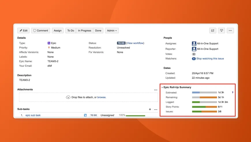 Embedded Epic Roll-Up Summary on the issue details page for real-time insights into project information. Perfect for Project or Product Managers, Scrum Masters, Executives, and more.