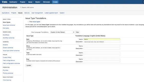 Epic to Feature app saves Jira Admin's time translating "Epics" across Jira and taking care even of such things as articles and messages. You only specify the word to translate to, and the app will take care of it.
