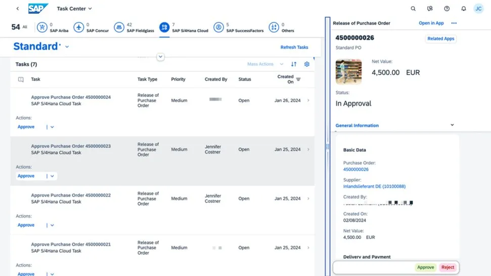 Drive productivity through an integrated experience by using the SAP Task Center service for a unified view of approvals and tasks across multiple SAP applications. A single-workflow inbox for all tasks
