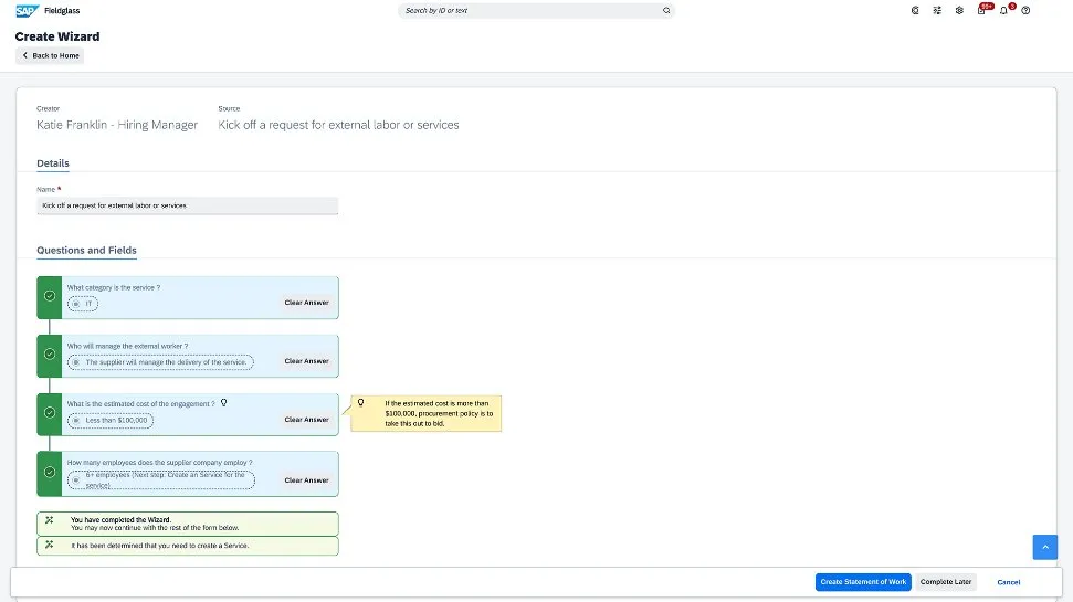 Procurement teams face mandates to control costs, streamline processes, reduce risk, and meet strategic goals. With one holistic services procurement solution, you can track the “who, what, where, when, why, and how” of each project to meet demands and support project success. Find, engage, manage, and offboard external services providers quickly and efficiently – from consulting firms and marketing agencies to security companies – with the SAP Fieldglass Services Procurement application.