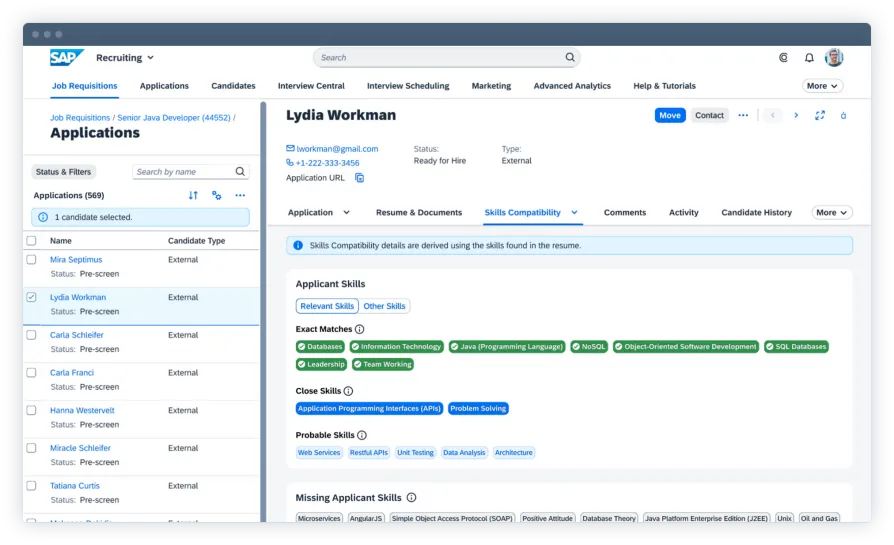 Simplify applicant selection with AI-enabled tools to promote equitable, skills-based hiring. AI-assisted applicant screening Hire talent with the right skills by using AI that compares applicants’ skills to jobs, enabling recruiters to make smarter hiring decisions. Applicant management Boost recruiter efficiency with streamlined screening and hiring capabilities that allow them to focus more on engaging with candidates. Global support Reach candidates and recruiters in 46 languages and adhere to global data privacy laws with data privacy controls. Extensive ecosystem Access more than 70 integration partners or comprehensive APIs for nearly unlimited opportunities to extend your global recruiting management solution.