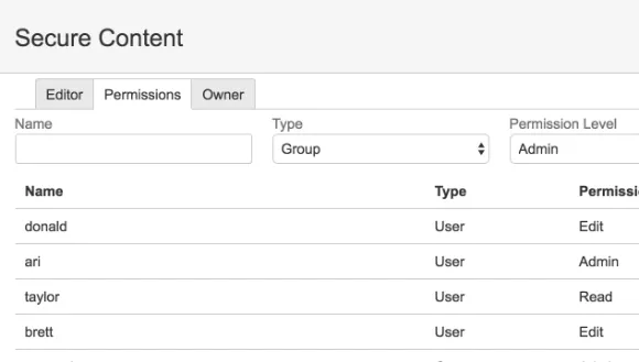 - Configure user or group permissions to read, edit, or manage secure content blocks