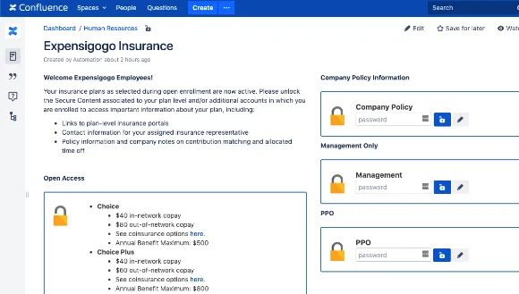 Minimize context switching and the burden of managing content in disparate tools by encrypting passwords and other sensitive information in secure content blocks within your Confluence pages.