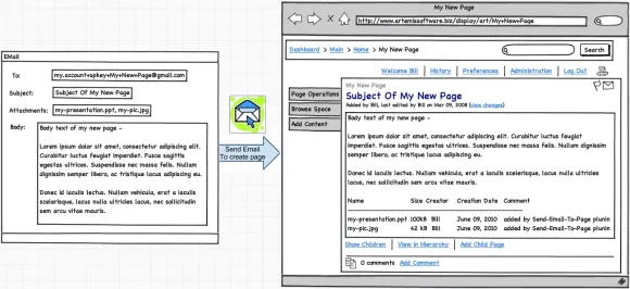 Conceptual representation of sending an email to Confluence which creates content in the form of a page or blog with attachments