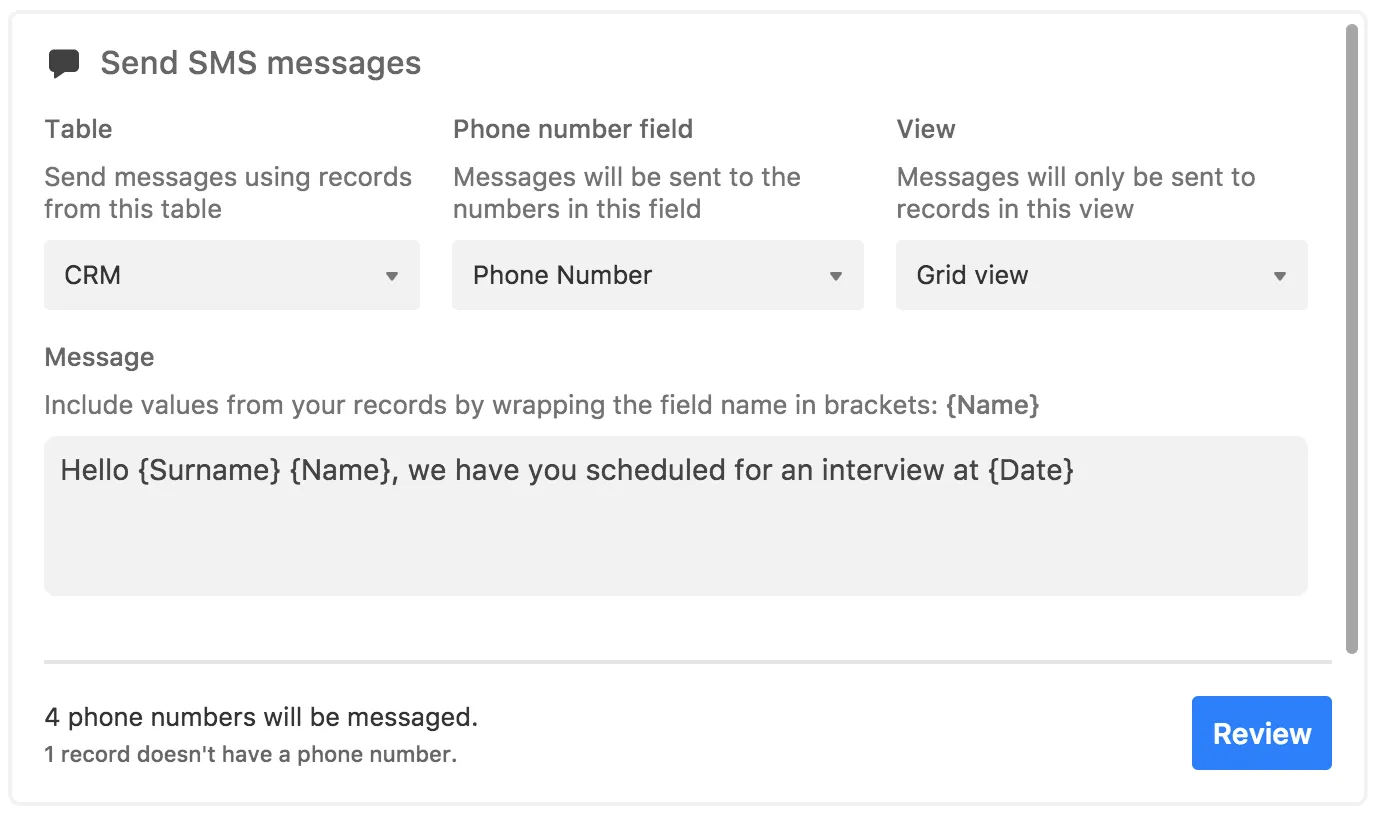 Send text messages to contacts in Airtable using Twilio with the Send SMS app.