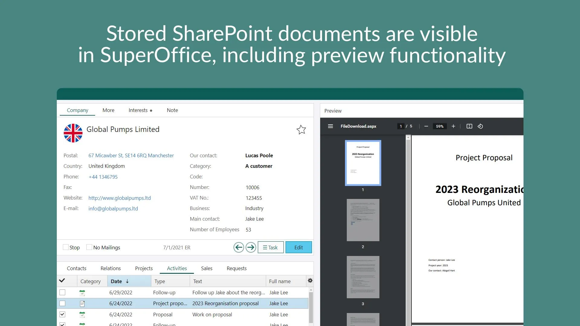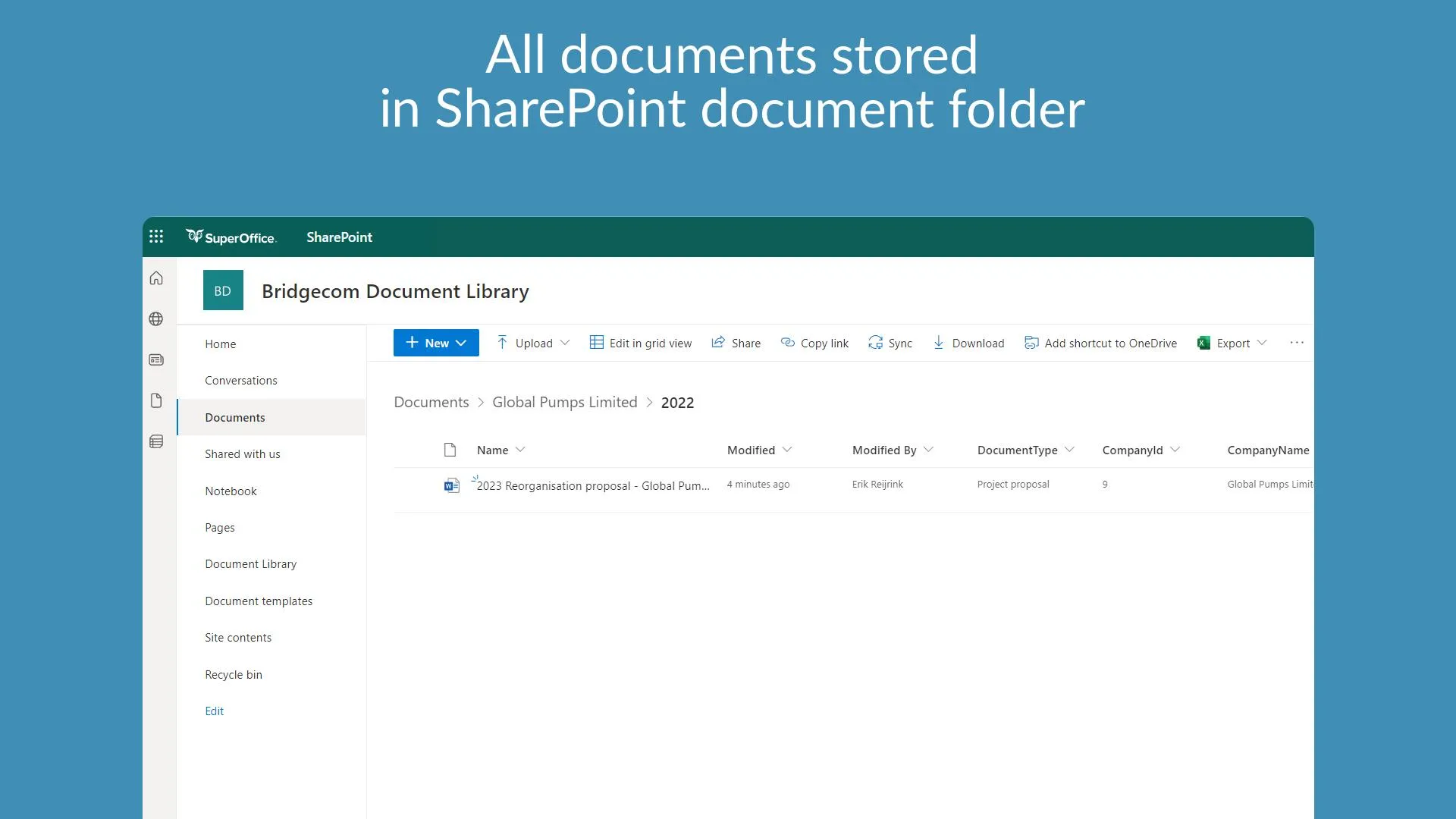 However, more and more companies are working in the cloud because of all the new capabilities and benefits it offers. Not surprisingly, businesses opt for the cloud-based tools available in Microsoft 365 or Google Workspace to create documents. They also employ more advanced tools like Microsoft SharePoint to store, share and work with documents. If your company already uses or plans to use SharePoint and SuperOffice CRM, a document can live in two separate places.