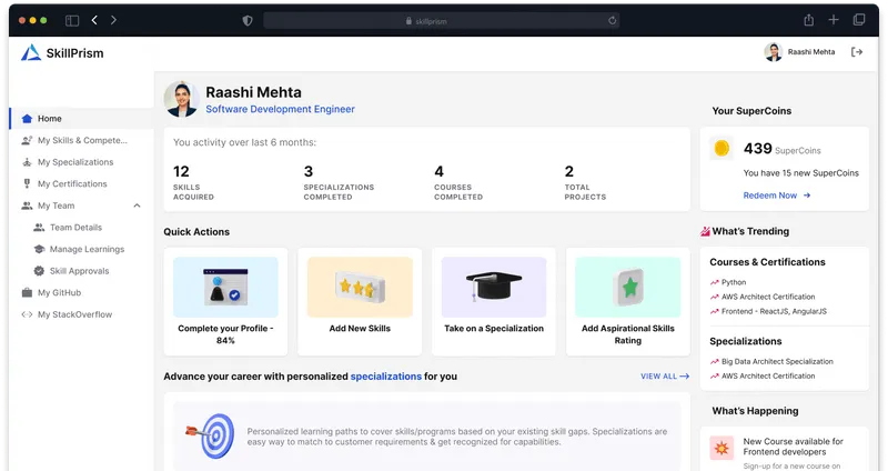 - Specializations & Career Paths: Guides employees through lifelong learning with tailored career paths and recommendations.