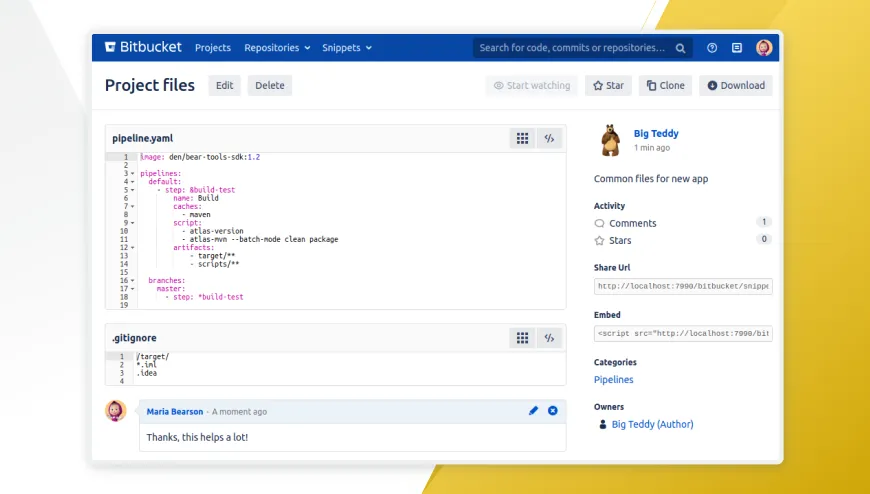Easily create and share code snippets in Bitbucket.