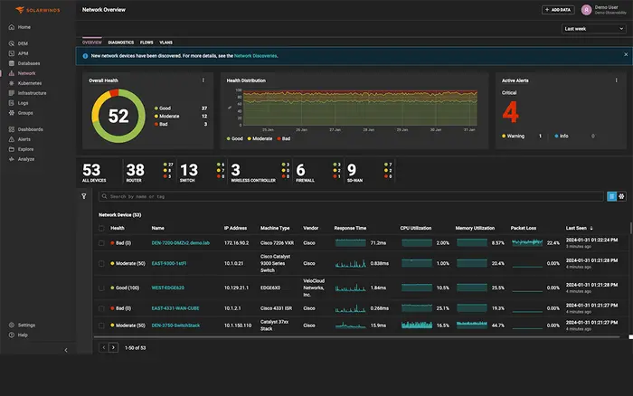 - Seamless Integration: Integrates with SolarWinds Observability Self-Hosted to provide a unified view across multi-cloud, hybrid, and on-premises environments.