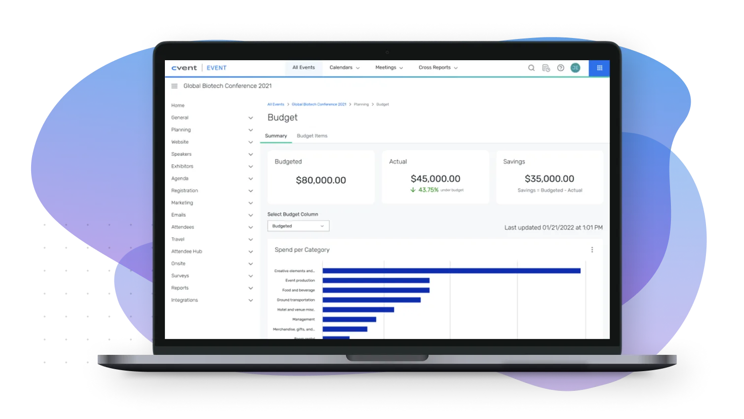 With tighter budgets and more economic uncertainty, you need a centralized tool that can help streamline event budget planning and automate your event planning process. With our Spend and Workflow Solutions, you can automate those tedious processes and have total control and visibility into all your meetings and events.