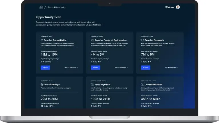 Spend & Opportunity combine McKinsey expertise, data modeling, and design thinking for maximum performance and innovation in procurement analytics, providing you with insights and trigger actions for value capture, risk mitigation, and process improvement across use cases. In addition to our large library of off-the-shelf analytics use cases, we also co-innovate with clients to solve specific analytical challenges.
