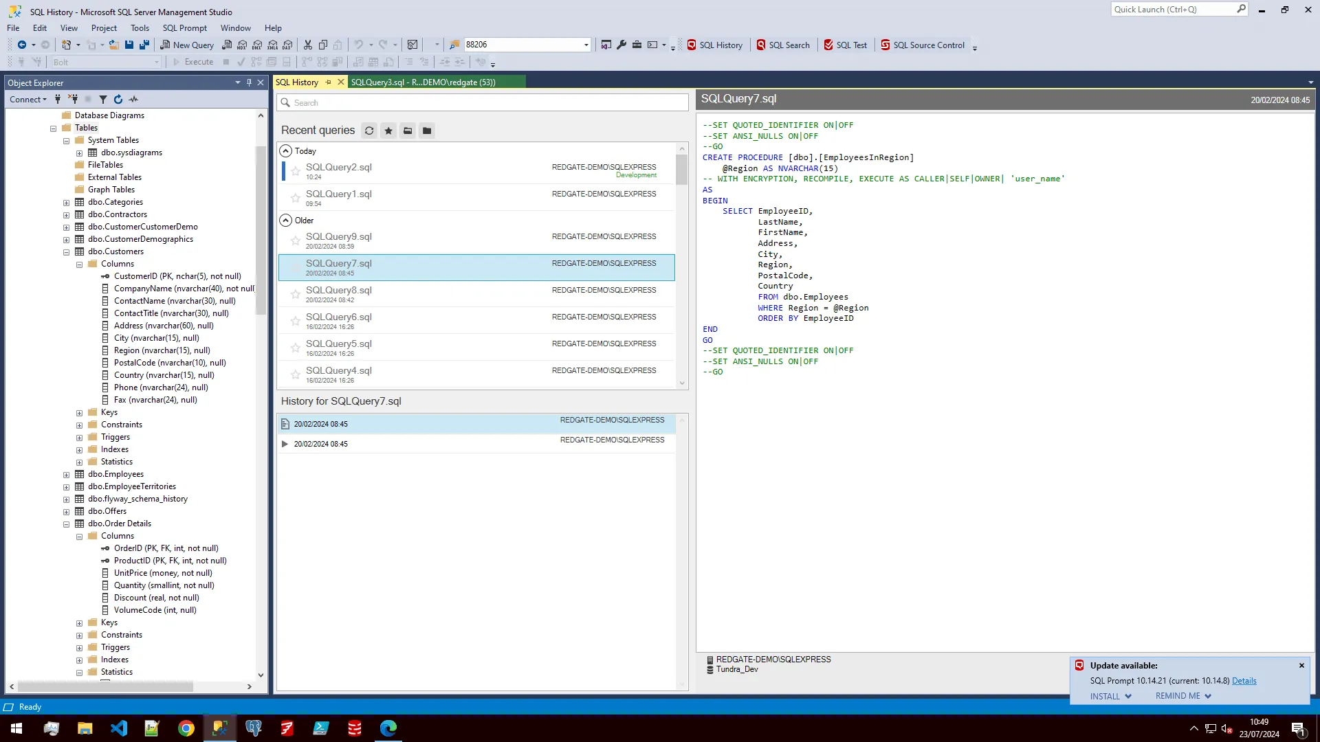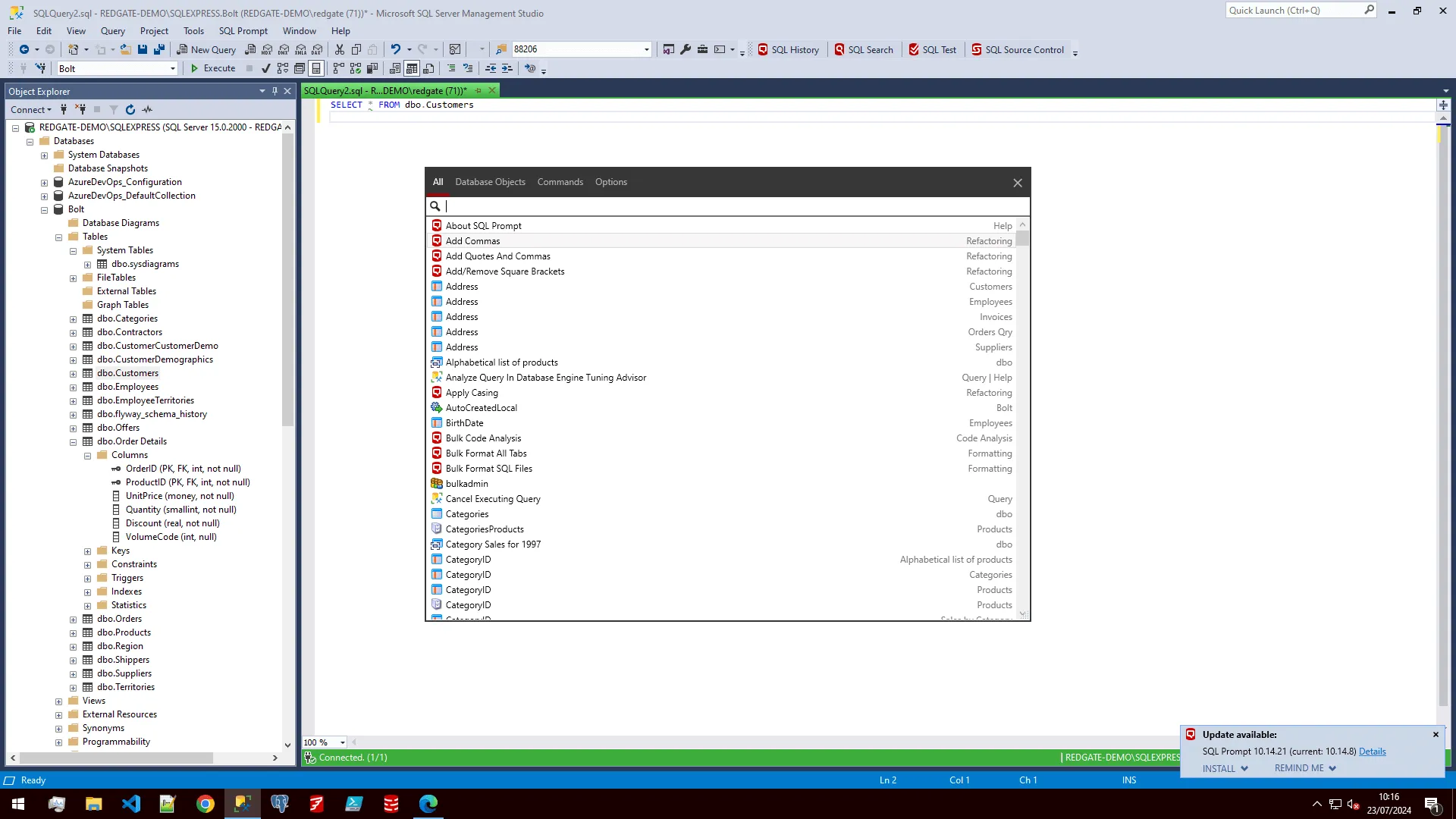 Supercharge productivity with features to increase coding speed and accuracy. SQL Prompt helps you to double coding speed with IntelliSense-style code completion, one-click SQL formatting, customizable code snippets, SQL query history, and more. As well as saving you hours of effort, SQL Prompt reduces errors by analyzing code as-you-type, auto-fixing issues, safely refactoring SQL, and simplifying standardization.
