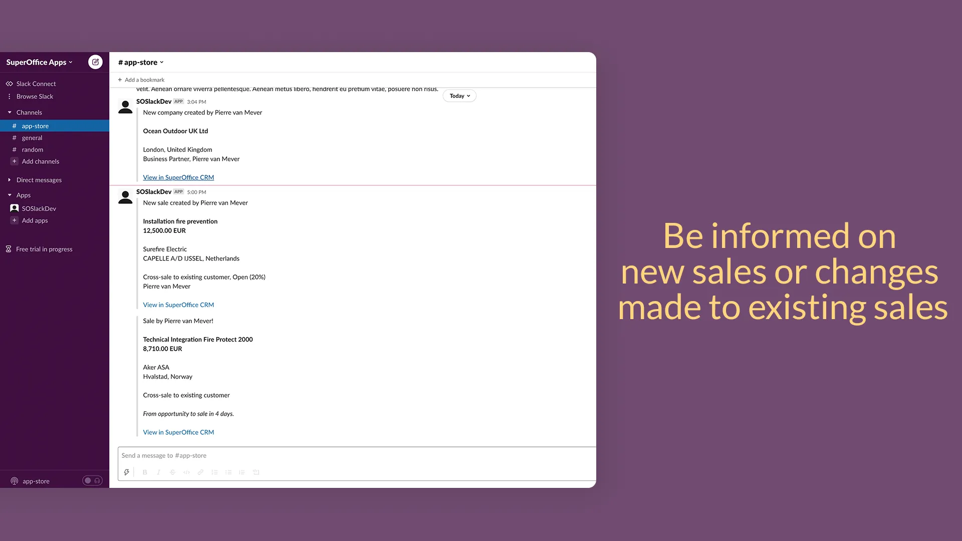 Slack is a digital workplace that connects you to the people and tools you work with every day. With the free SuperOffice for Slack app, you can now get notifications when something new happens in SuperOffice CRM -- directly within Slack. No need to waste time flip-flopping between multiple systems; just work where you want with SuperOffice CRM and Slack. Be always informed on what is happening to your customers in SuperOffice CRM and receive notifications within Slack. You control on which SuperOffice objects you want to receive a notification on.