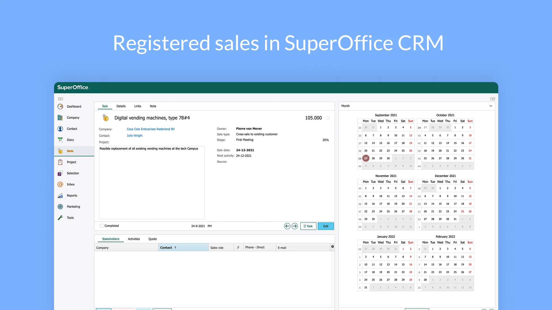 - See all the relevant information for SuperOffice sales, company, sales stage, amount, etc.