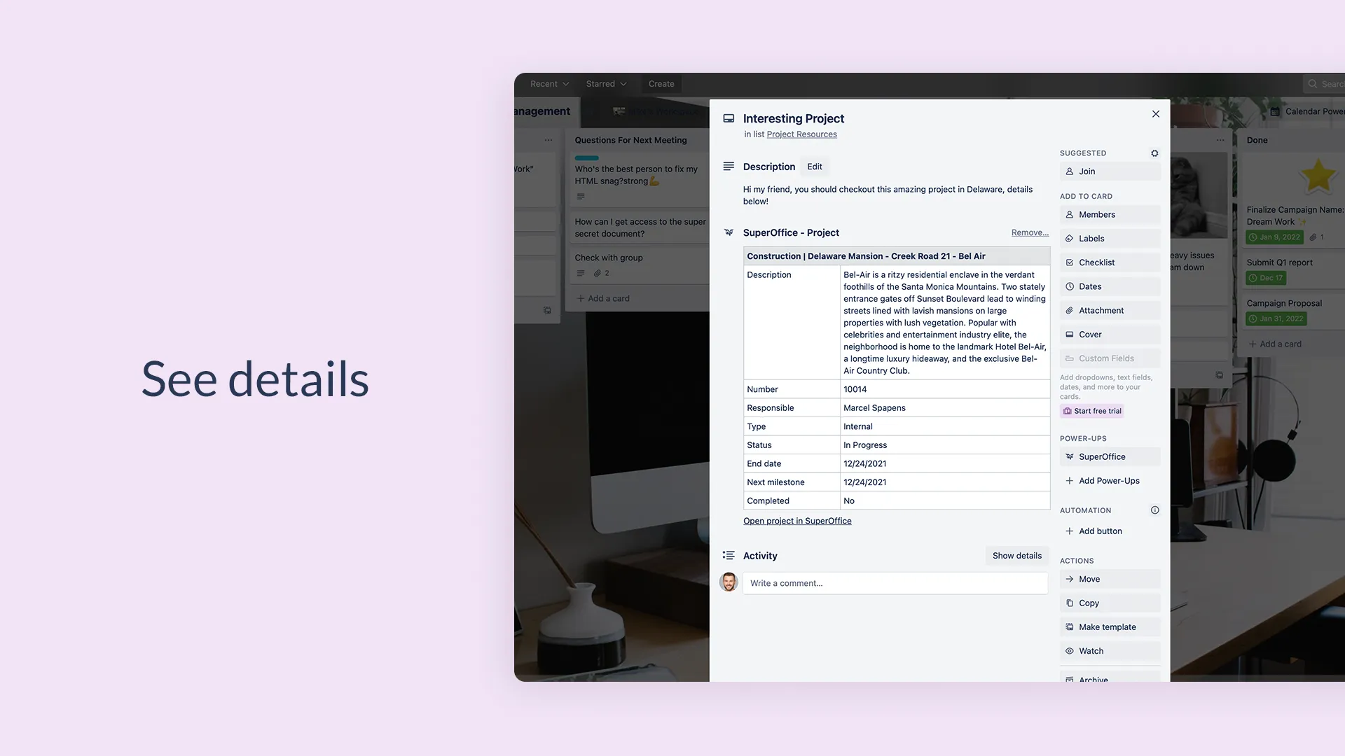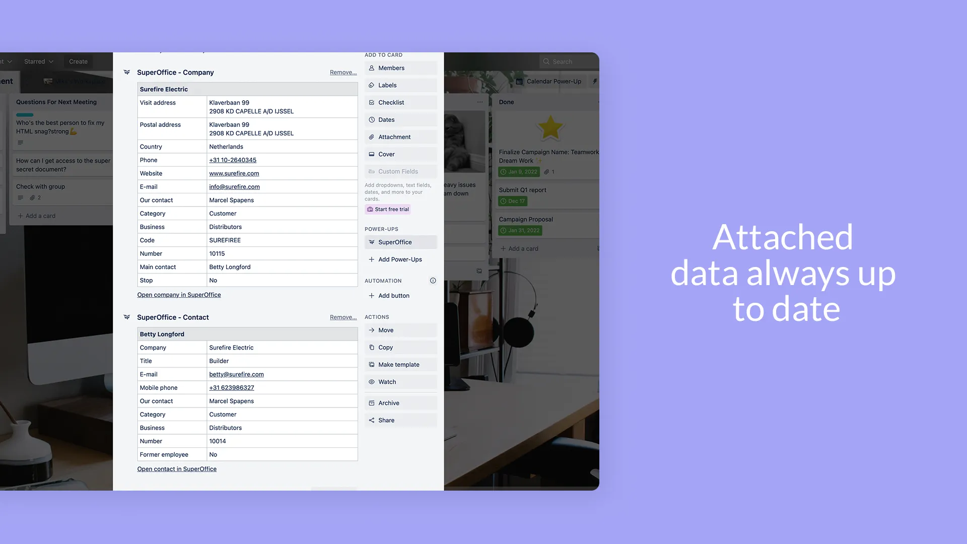 Trello is a collaborative work management app designed to track team projects, highlight tasks underway, show who they are assigned to, and detail progress towards completion. With the free SuperOffice for Trello app, you can bring information about sales opportunities, leads, contacts, and projects to your Trello cards. Get this free SuperOffice for Trello app and have your favorite work management and CRM tool together at last.