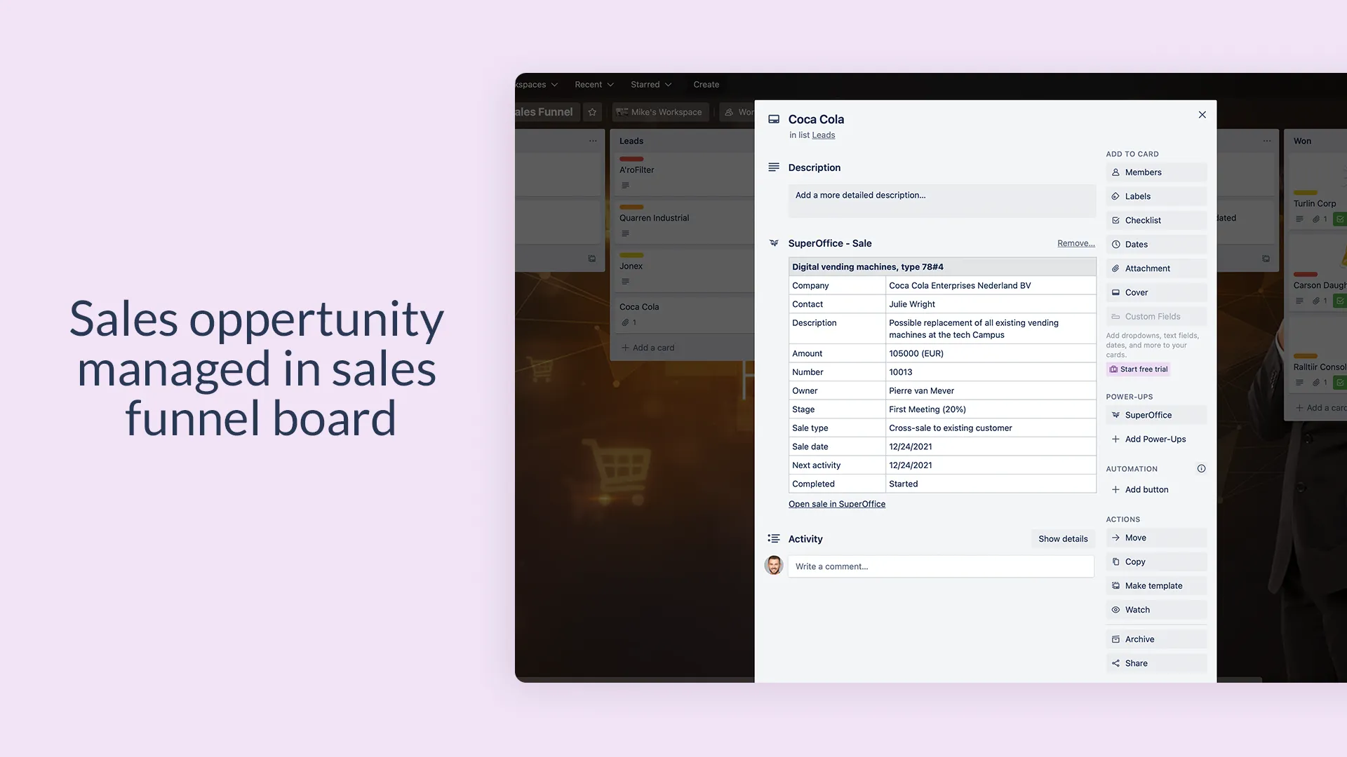 - Allow salespeople to track the progress of Trello tasks related to specific SuperOffice CRM opportunities.