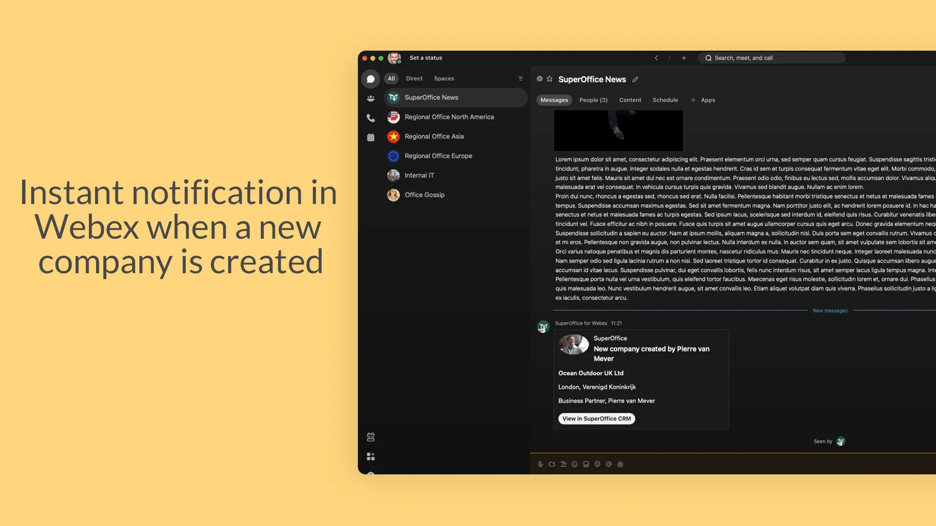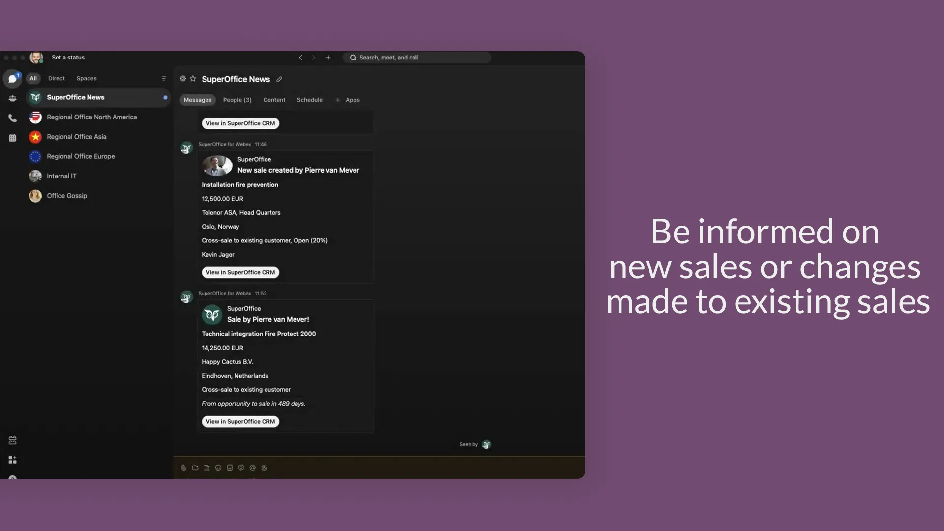 Webex by Cisco is a collaboration app that helps your team stay organized and have conversations all in one place. With the free SuperOffice for Webex app, you can now get notifications when something new happens in SuperOffice CRM directly within Webex. No need to waste time flip-flopping between multiple systems; just work where you want with SuperOffice CRM and Webex. Get started be always informed on what is happening to your customers in SuperOffice CRM and receive notifications within Webex by Cisco. You control on which SuperOffice objects you want to receive a notification on.