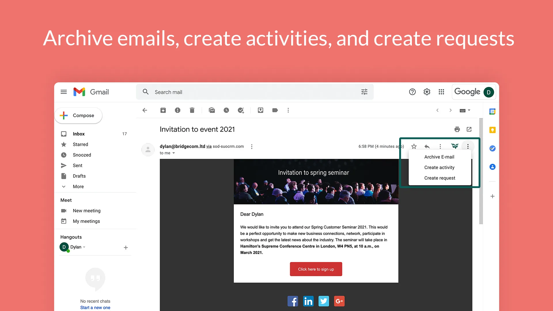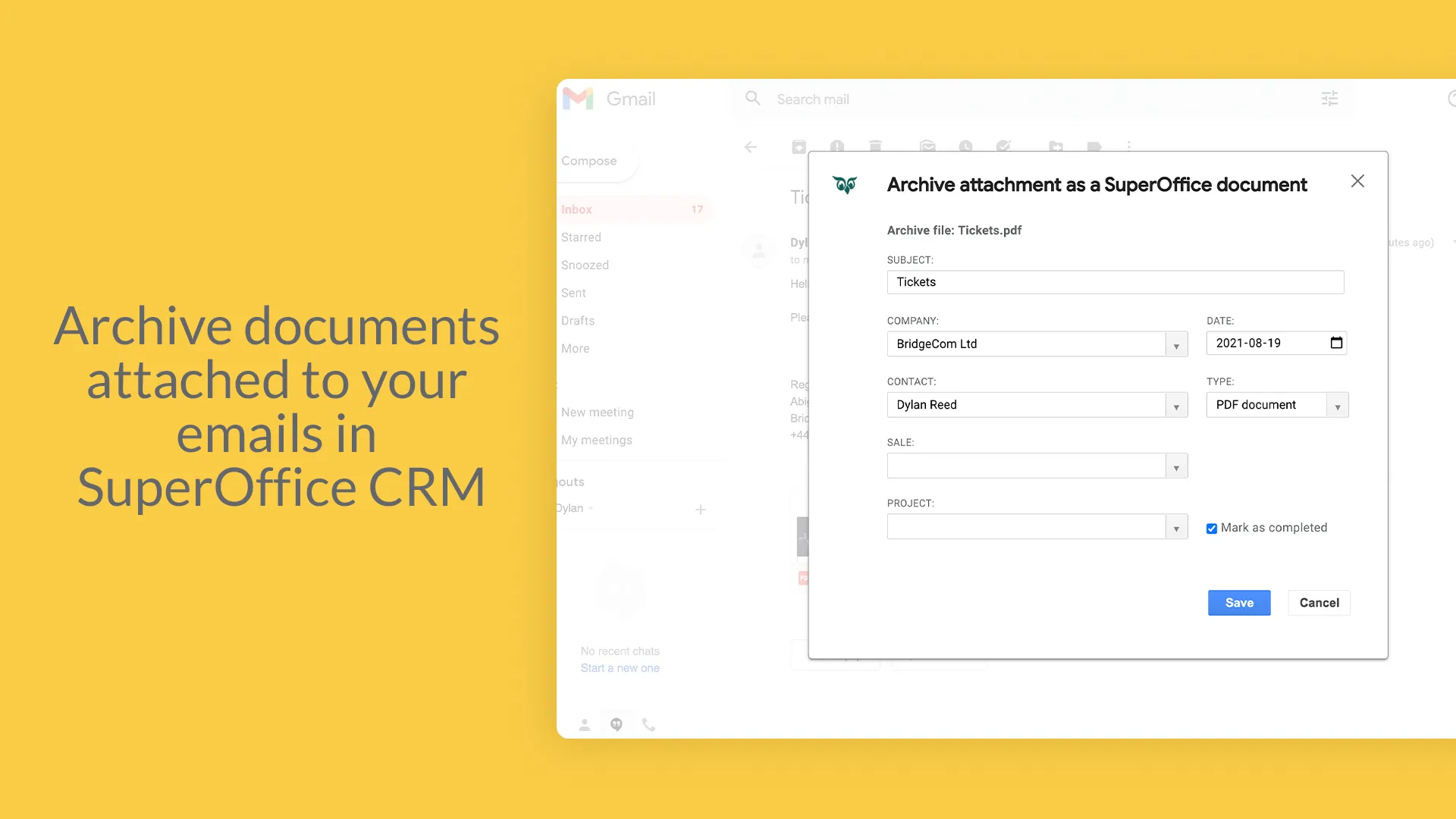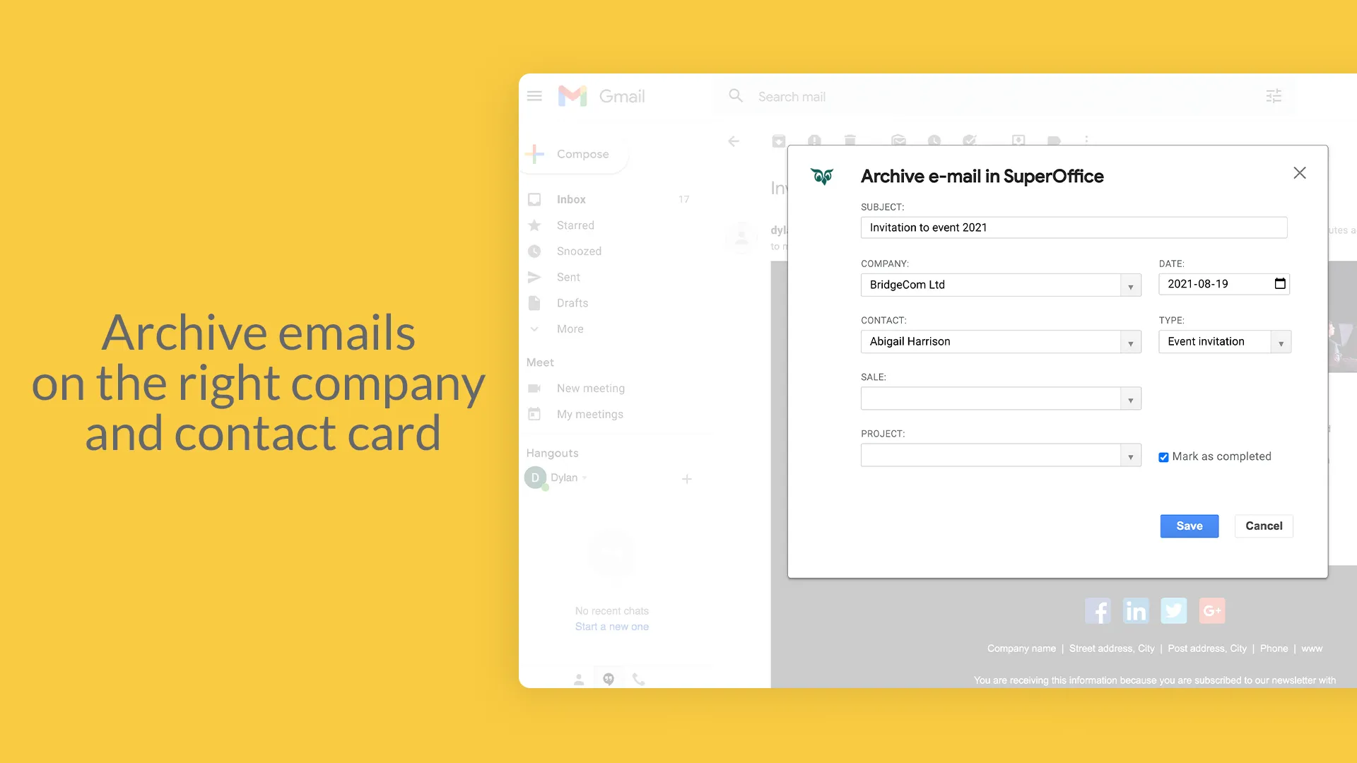 Archive emails and add contact details directly from your Google Gmail inbox into SuperOffice CRM.
