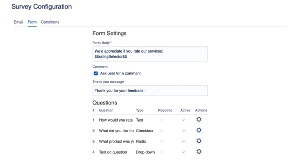 Leave Jira's default 5 stars + one comment surveys in the past. Tailor your surveys any way you want - add HTML formatting, define trigger conditions, stylize different types of custom questions, and more!