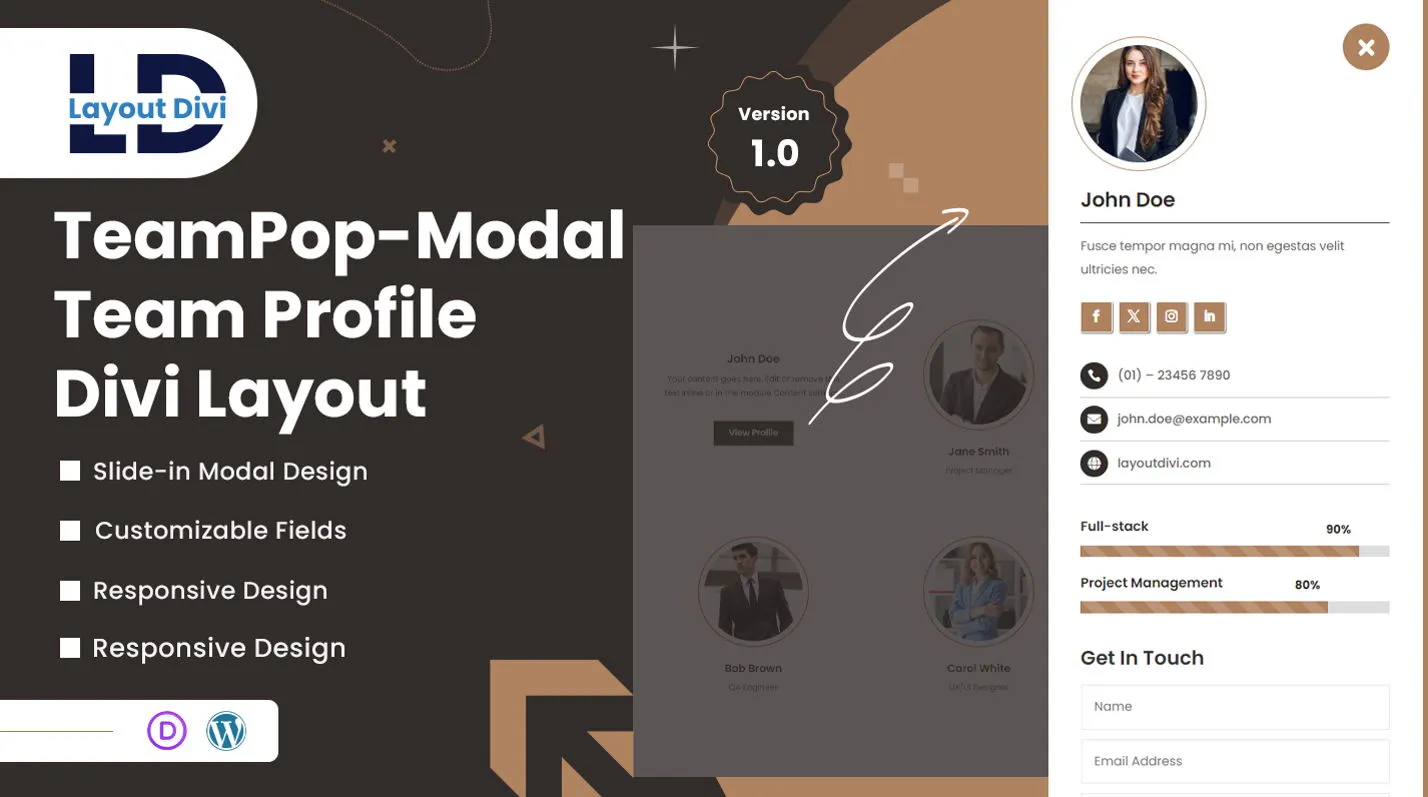 Improve your website with our Divi Team Member Popup Modal. This layout lets you easily display your team members in a modern, stylish way. A slide-in design shows each person’s profile, skills, and contact information. Perfect for any business, it helps you personalize your brand and build trust with visitors. Easy to set up and customize, it creates a professional and engaging experience for your audience.
