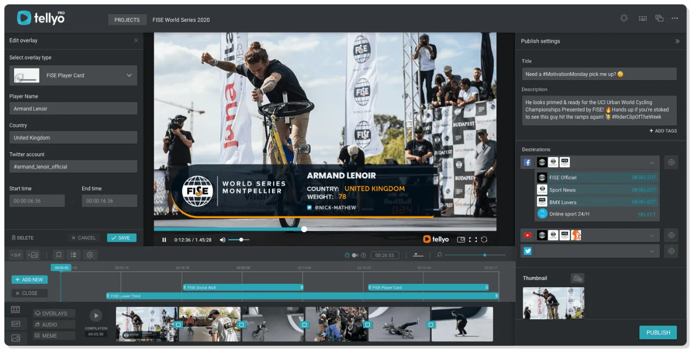 Create and publish branded video clips and highlights across 100+ destinations in under 30 seconds with Tellyo PRO.
