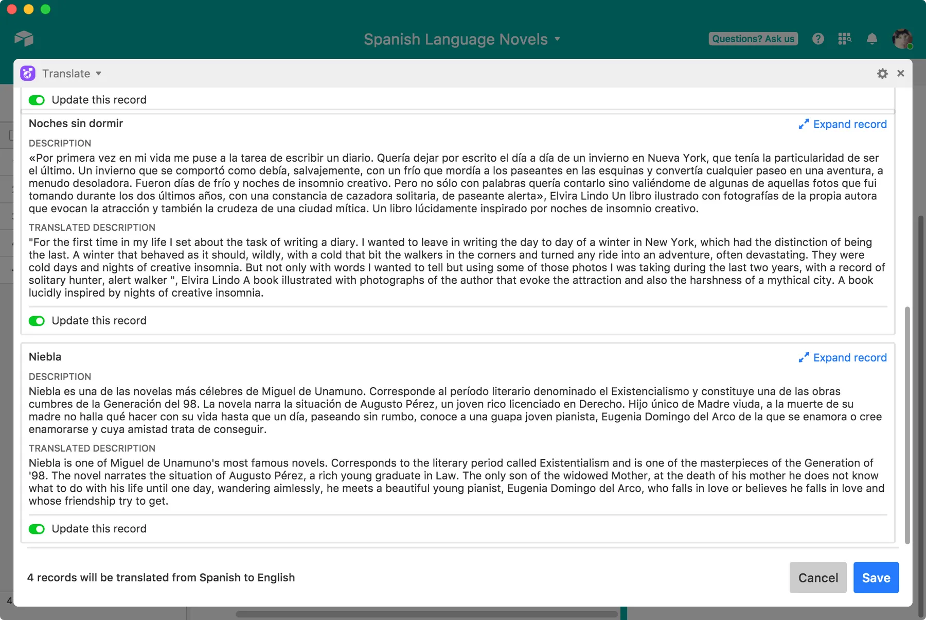 Translate text in Airtable using the Google Translate API with the Translate app.