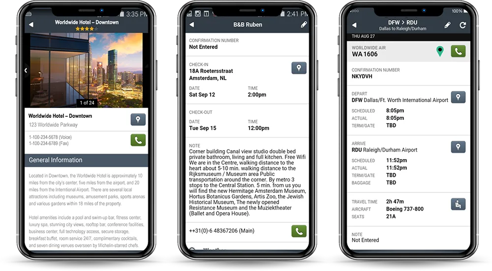 - Access relevant itinerary information at the destination, including airport terminal, gate information, hotel directions, or local ride-sharing requests.