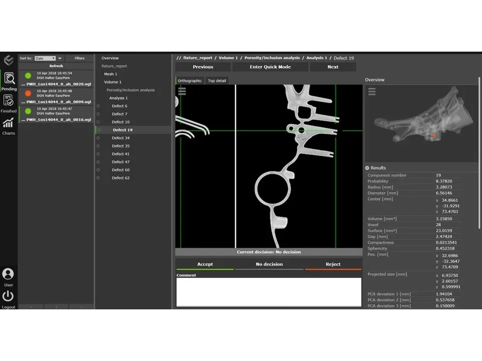 - Automated Inspection: VGinLINE monitors specified directories for new CT data sets and automatically initiates inspection routines based on predefined templates. This automation reduces manual intervention and accelerates the inspection process.