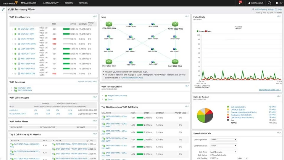 - VoIP Call Quality Monitoring: Tracks and analyzes call detail records (CDRs) from Cisco Unified Communications Manager and Avaya Aura Communication Manager, providing insights into call quality metrics such as jitter, latency, packet loss, and mean opinion score (MOS).
