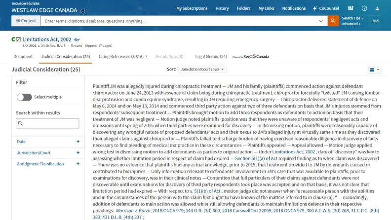 - **Use Judicial Consideration for Statutes to quickly find relevant cases: **Access an editorially created list of cases that interpret statutes and meaningfully explain and clarify legislation. Save time by avoiding sifting through all the Citing References to determine what is relevant to you.