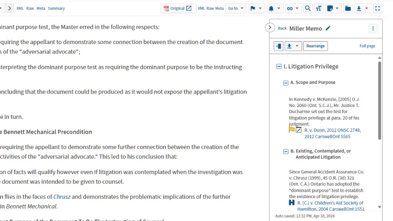 - **Easily build detailed outlines: **Open Outline Builder side by side with a document you find while researching without ever leaving Westlaw Edge Canada with CoCounsel. Drag and drop important text or citations directly into your outline.