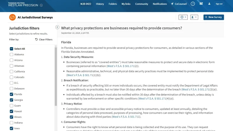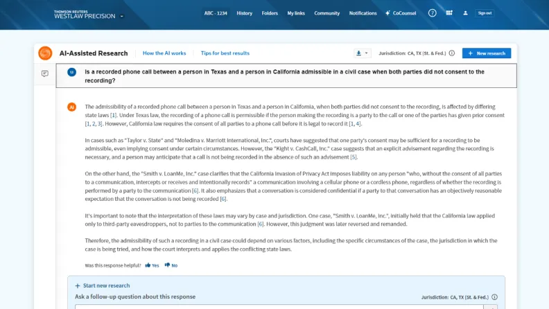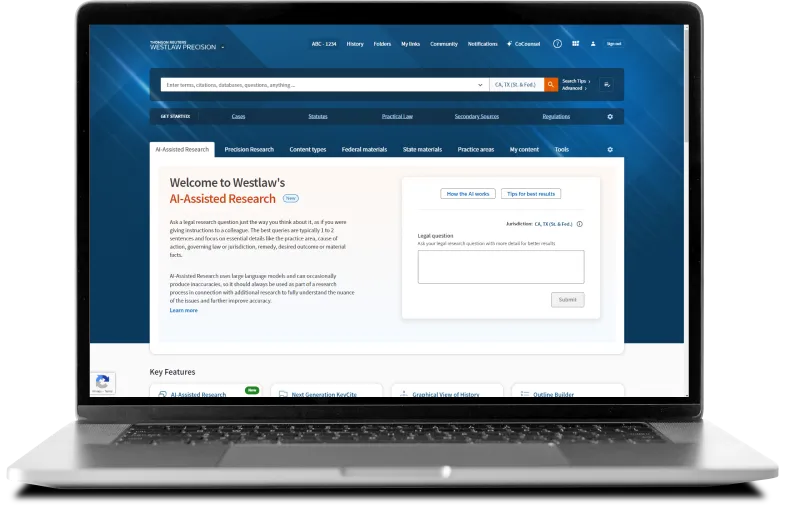 - **Jumpstart your legal work with AI-Assisted Research: **Get relevant answers to your legal research questions with AI-Assisted Research. Verify the results using links to trusted Westlaw authority so you can make better-informed decisions and complete the remainder of your research more efficiently.
